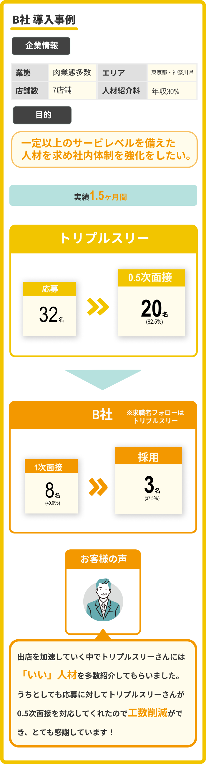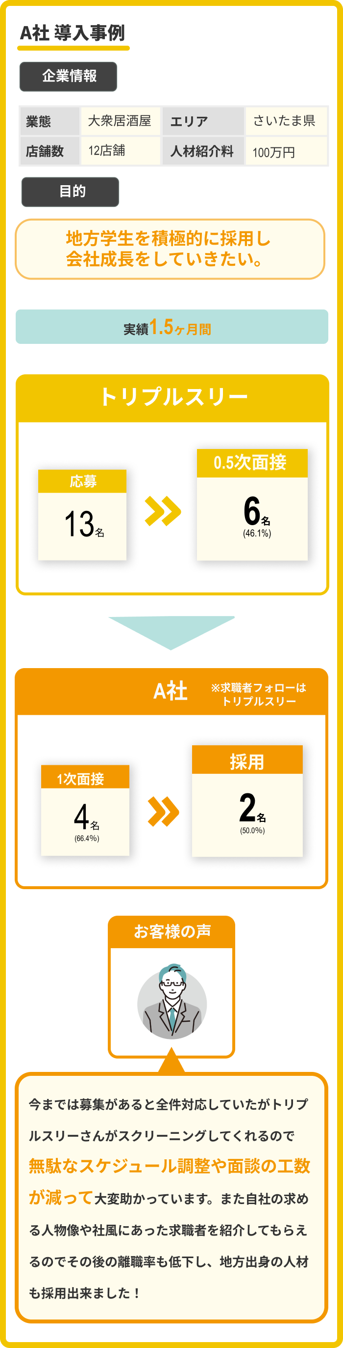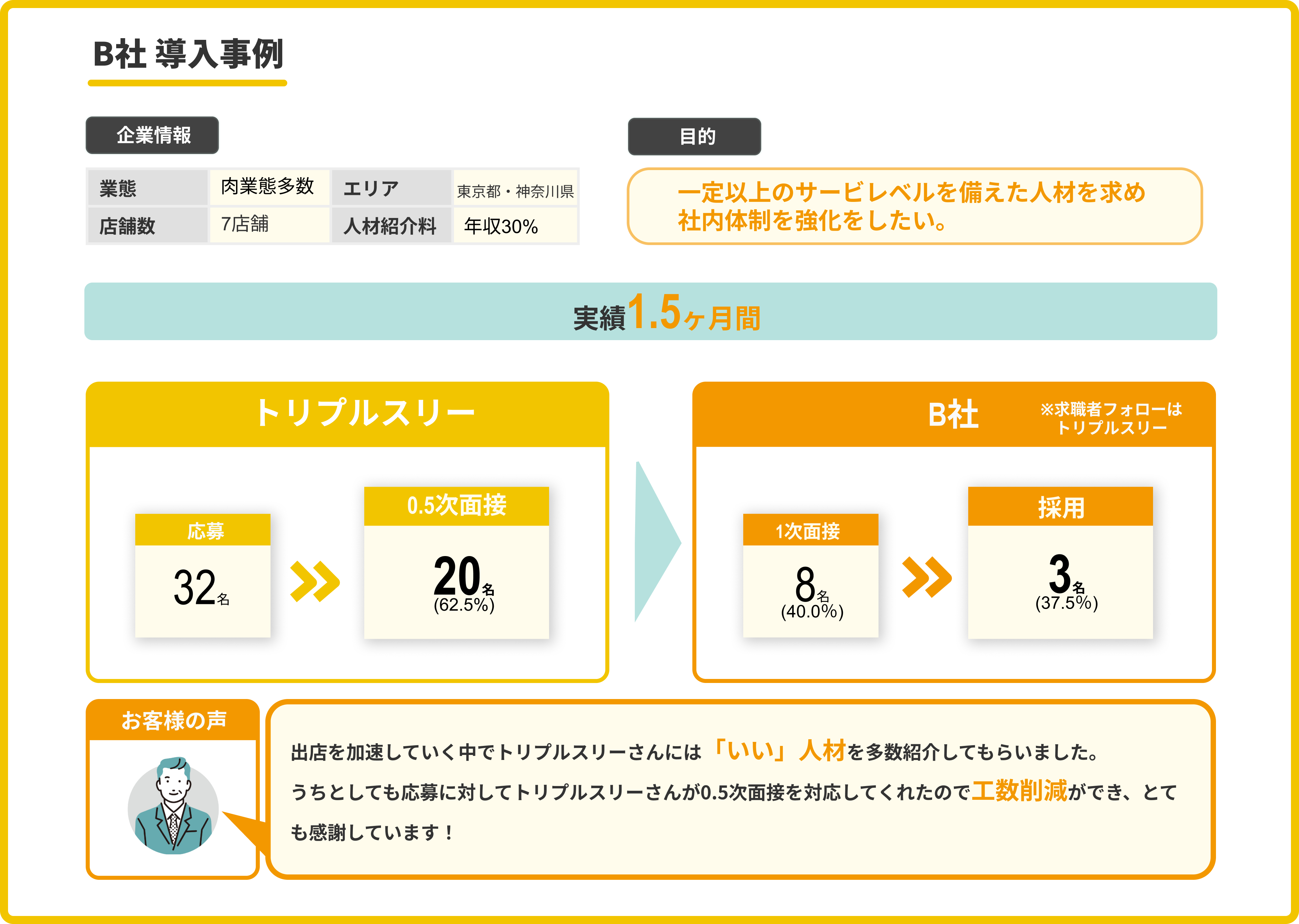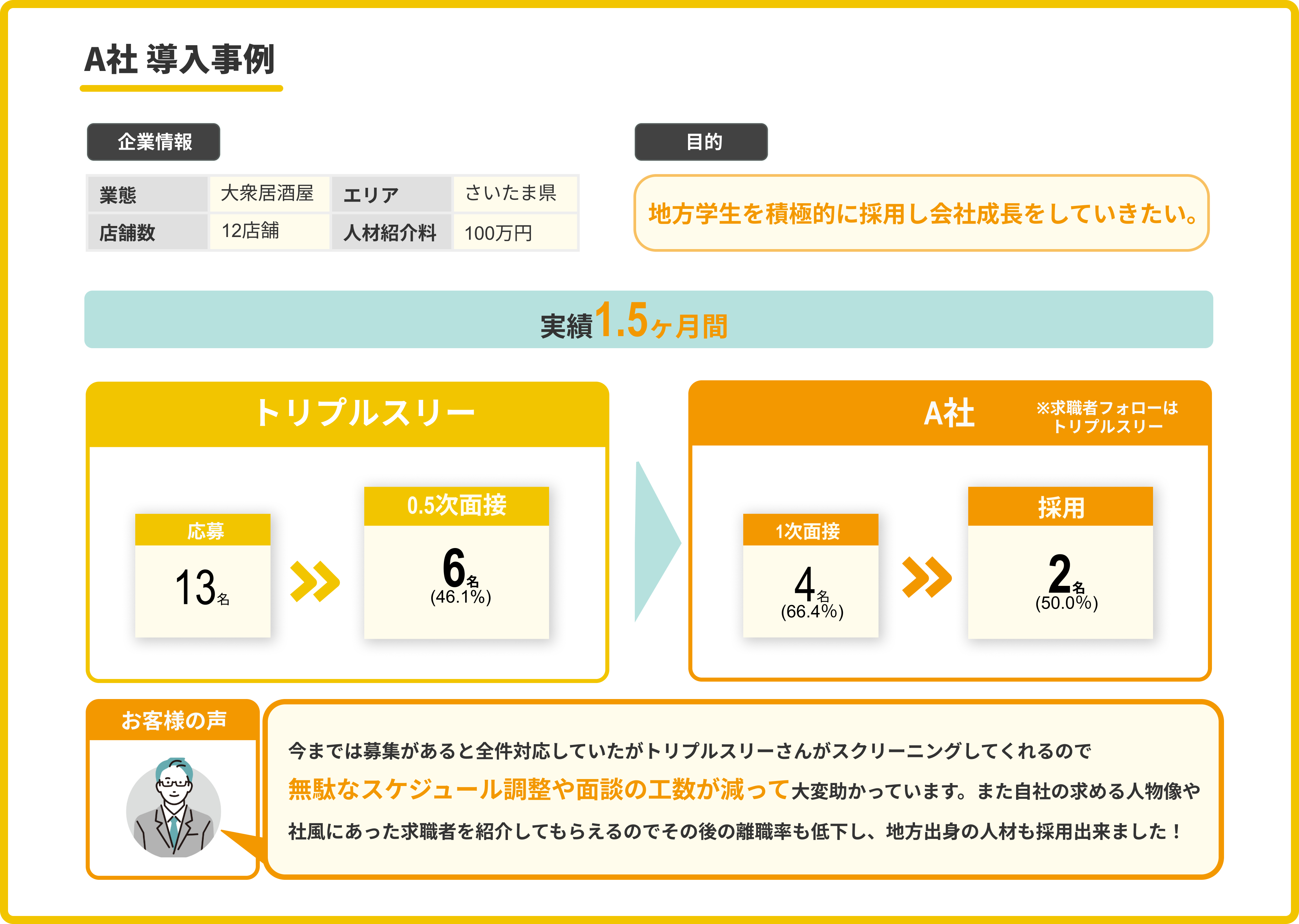 弊社が求職者と密な面談(0.5次面接)を行うことで求職者の水準レベルを担保しつつ、初期の面談対応の労力を大幅削減。
